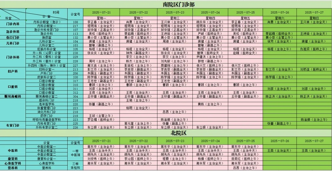 【一周门诊信息】7月21日至7月27日