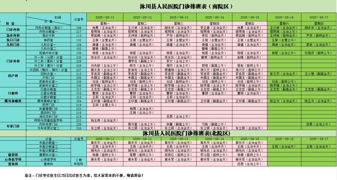 【一周门诊信息】8月11日至8月17日
