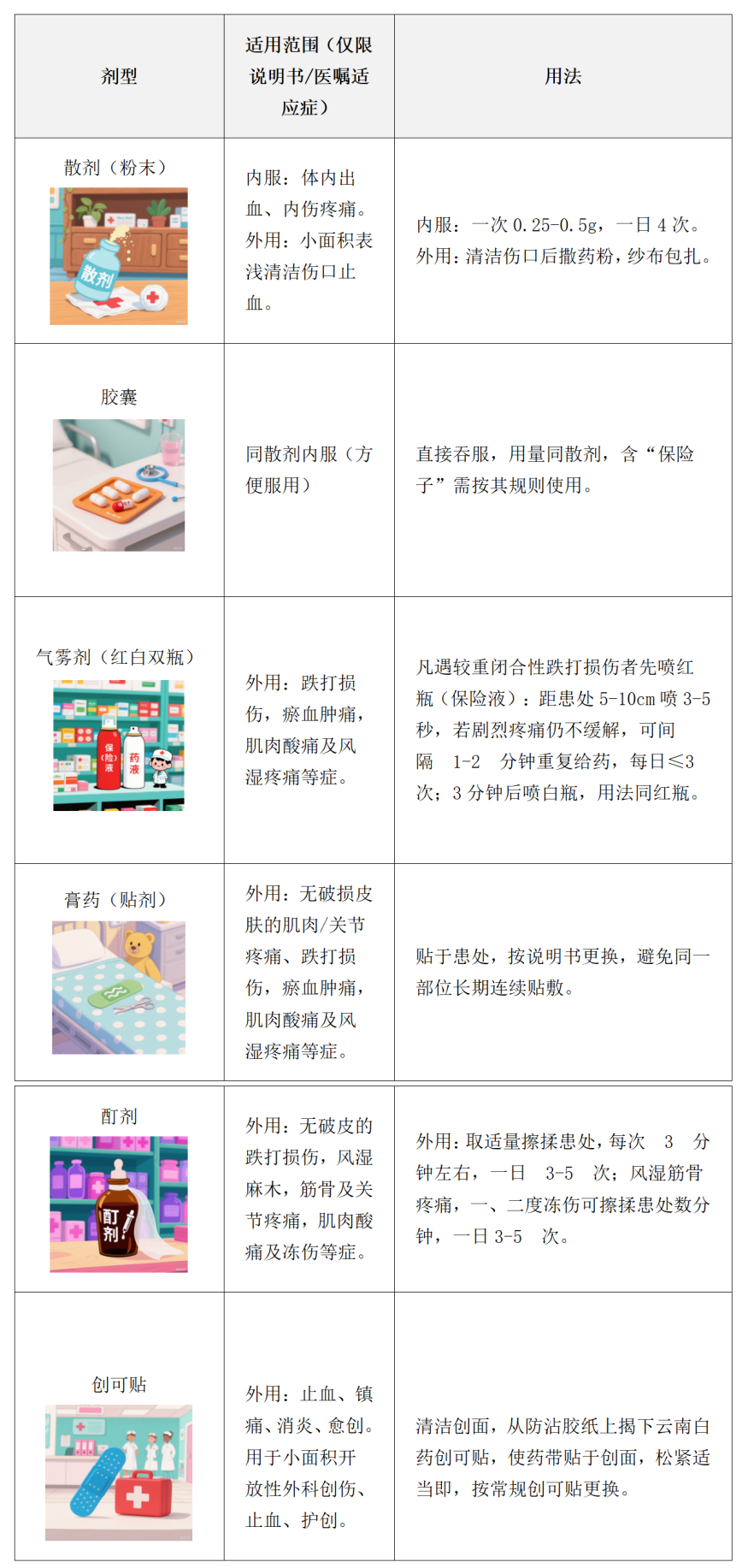 【沐医科普】“云南白药”的合理使用发表时间:2025-09-29 17:04 云南白药作为临床常用中成药,在跌打损伤、创伤出血等场景中应用广泛,其核心价值在于规范使用下的止血、止痛、消肿效果。 一 核心成分与特性 ![]() 1.成分特点:核心组方为国家保密配方,公开成分包括三七(化瘀止血)、制草乌(温经止痛,需严格控量)、重楼(解毒消肿)、麝香及冰片(增强渗透与镇痛),成分协同实现疗效。 2.“保险子”说明:仅存在于散剂/胶囊中(红/朱红色小丸,单独包装),药性较强,仅用于危重外伤/内伤出血(如严重跌打出血、吐血、咯血),轻伤及其他病症不必服用。 ![]() 二 主要功效 ![]() 临床核心作用为化瘀止血、活血止痛、解毒消肿,适用于:外伤出血(表浅/中度出血);跌打损伤引发的肿胀、疼痛;瘀血阻滞导致的局部肿痛;轻度软组织炎症、疮疡肿毒(辅助消肿)。 三 常见剂型与规范用法 ![]() 不同剂型适用场景差异大,需严格区分内服/外用,避免混淆: ![]() 四 用药安全警示(重点) ![]() 1.绝对禁忌 孕妇禁用所有剂型(包括外用),因活血成分可能致流产或影响胎儿。 2.过敏风险 对本品或成分(如麝香、制草乌)过敏者禁用;外用前建议小范围皮肤测试,出现红肿、瘙痒立即停用清洗。 3.剂量与疗程 严禁超量、超疗程使用!内服需警惕制草乌毒性,儿童、老人、肝肾功能不全者必须遵医嘱调整用量;不建议长期内服或大面积外用,症状缓解后停药。 4.剂型使用禁忌 散剂外用:禁用于深部伤口、污染伤口、大面积烧伤、动物咬伤(需立即就医)。 气雾剂/膏药/酊剂:仅用于完整皮肤,禁用破损皮肤、黏膜(眼、口、鼻等)。 5.内服特殊注意 哺乳期妇女、严重心律失常/心脏病患者需医生评估后使用;服药期间忌蚕豆、鱼类及酸冷食物;出现唇舌发麻、胸闷、心悸、恶心呕吐,立即停药就医(警惕乌头碱中毒)。 6.不可替代专业医疗 以下情况必须先就医,不可自行用药:大出血、深部伤口、骨折、脱臼、内脏损伤、动物咬伤、伤口感染;不明原因出血(如便血、妇科大出血)或持续疼痛(避免掩盖病情)。 云南白药需在“对症、合规”前提下使用:明确剂型对应的内服/外用属性,牢记孕妇禁用、过敏禁用等核心禁忌,严格按说明书或医嘱控制剂量与疗程;“保险子”仅用于危重情况,不可常规使用。 用药前务必仔细阅读说明书,核对信息无误后再使用,若有疑问,务必咨询药师或医师,确保用药安全。 如有用药疑问请咨询临床药师! 药学门诊:南院区门诊二楼218 坐诊时间:每周一上午 咨询电话:0833-4603745 文稿丨梁龙杰(药剂科) |
